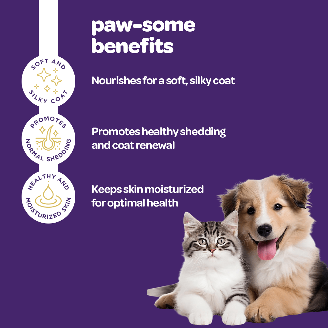 A premium supplement crafted to enhance your petβs coat and skin health from the inside out. Rich in omega-3 fatty acids and nourishing nutrients, our salmon oil offers a multitude of benefits for your beloved companion.