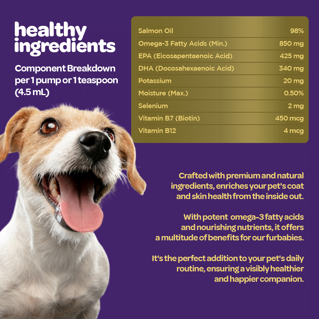 Elevate your petβs coat and skin health with our Sparkshine Wild Alaskan Salmon Oil. With its pure, natural ingredients and potent omega-3 fatty acids, itβs the perfect addition to your petβs daily routine for a visibly healthier, happier pet.