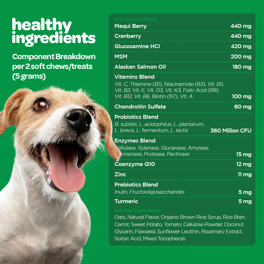 Our dog vitamins for immune system are enriched with essential vitamins and minerals that work together to strengthen your pet’s immune system, helping to defend against common illnesses and keep them feeling their best. Additionally, chews contain probiotics for gut health, promoting a balanced digestive system, as well as glucosamine to promote hip and joint health.
